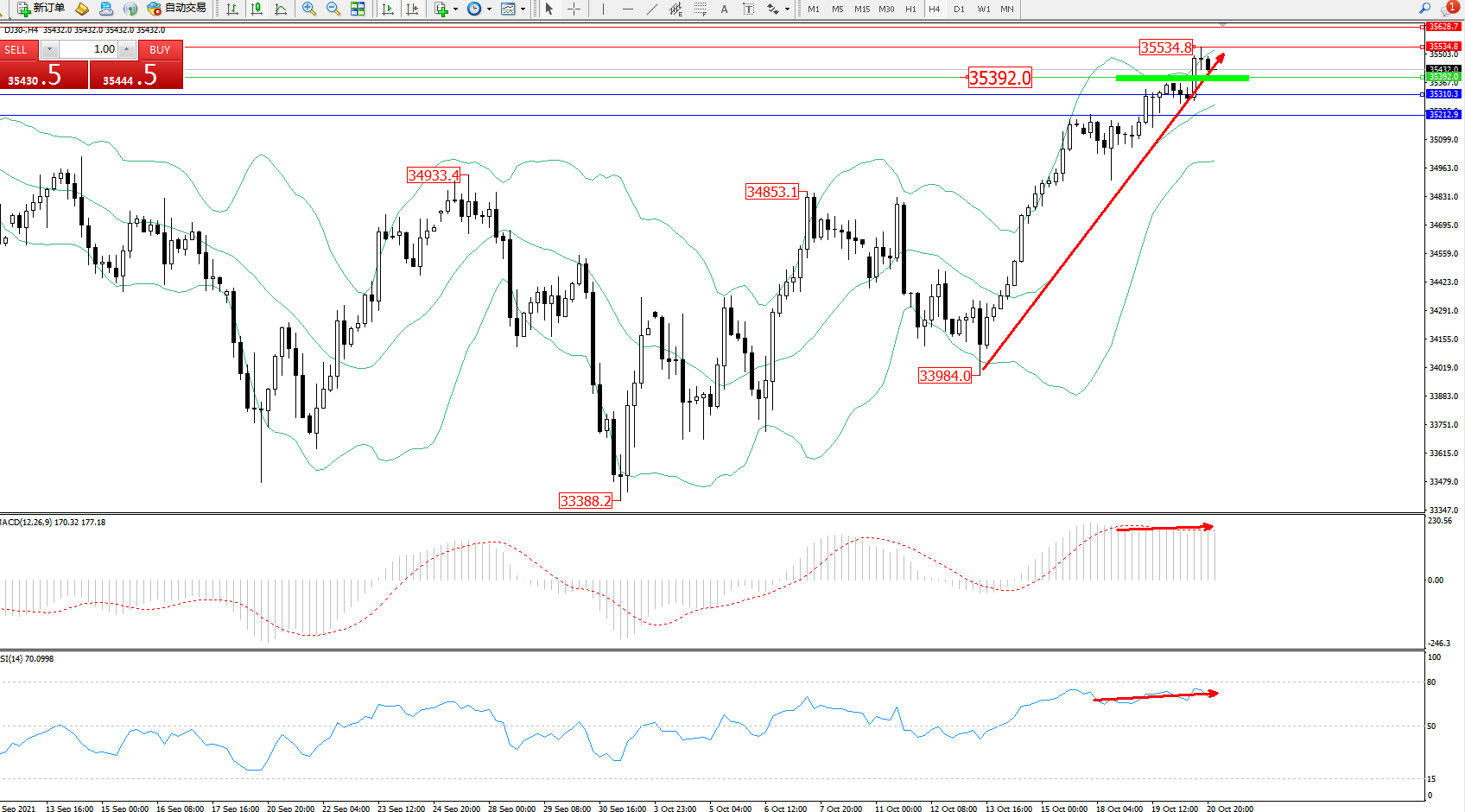 道琼斯指数DJ30——4小时K线图显示: