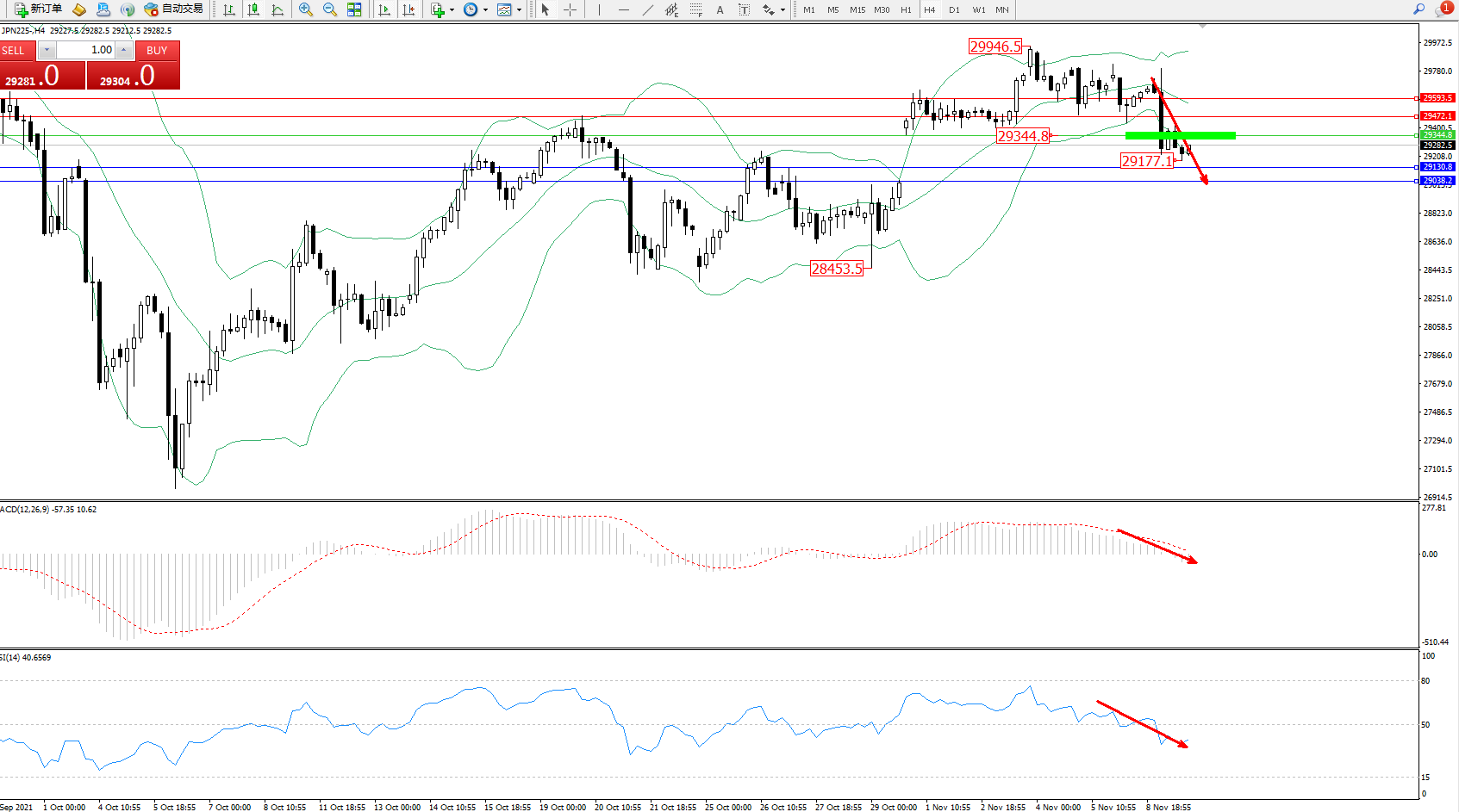 技术点评:高位波幅空间逐渐收窄,空头动力伺机入场,延续布林带指标下轨附近持续向下移动中,抵达29177附近开始整理,短期空头动力有急速整理下行迹象,布林带指标呈张口走势持续中,MACD指标空头动力维持弱势整理下行至0轴线下侧徘徊,RSI指标维持整理持续震荡下行至50均衡线下方空头区域弱势整理;