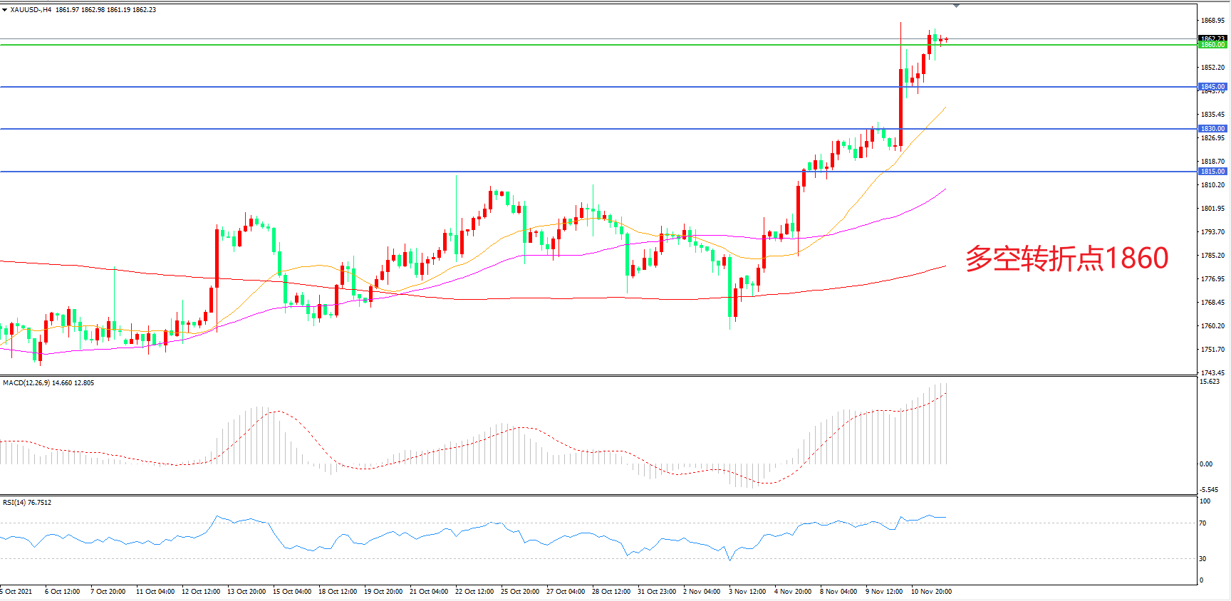 周四(11月11日),美国通胀数据创下31年来纪录高位,引发市场对抗通胀的忧虑和预期,现货黄金继续高歌猛进,收报1861.57美元/盎司。全球各国政府提供的数万亿美元抗疫救济资金刺激了商品需求,导致通货膨胀再次升温,如果美联储继续视通胀而不见,将会导致更多的投资者购入抗通胀资产,推动金价再创新高。