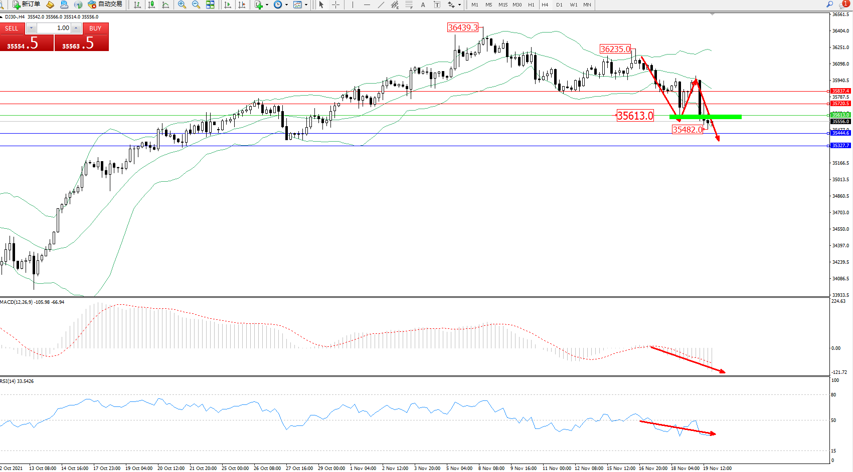 交易策略:35613下方看跌,目标35444、35327