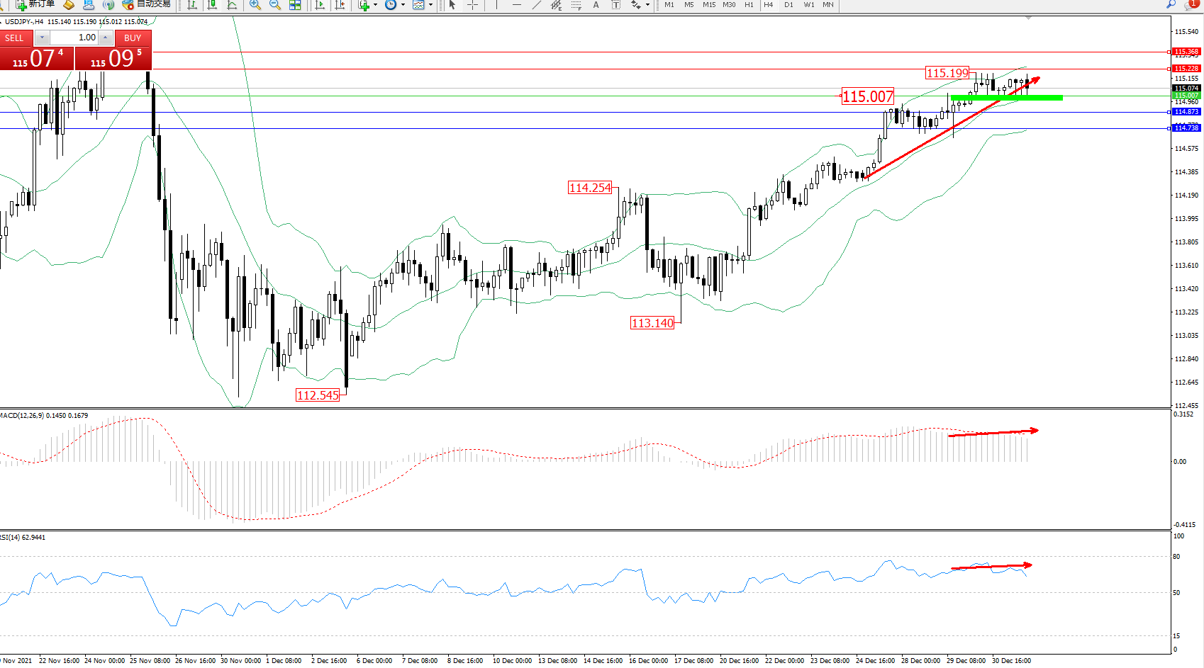 技术点评:多头动力延续布林带指标通道中上轨区间持续震荡上扬,高位抵达115.199位置附近开始整理平移,短期你多头动力开始疲软,但整体上扬趋势走势良好,布林带指标呈上行趋势走势持续中,MACD指标处于多头区域维持整理平移,RSI指标处于多头区域持续徘徊中;