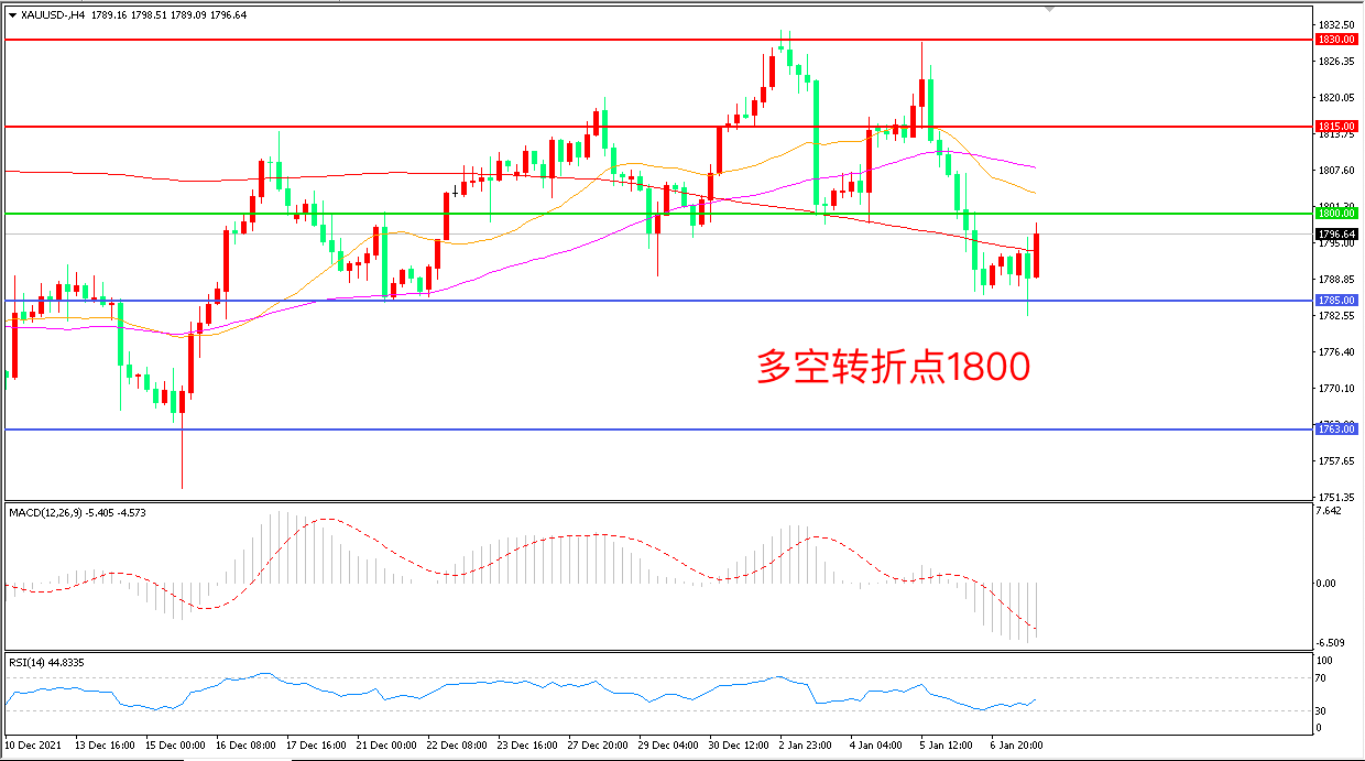 上周五(1月7日),美国1非农就业数据仅增19.9万,大幅不及预期的44.7万人,这也是非农就业数据连续第二个月大幅不及预期。数据公布后,现货黄金自低位震荡拉升,收报1796.64美元/盎司。但远与逊预期的非农数据并没有让市场对美联储今年加快加息的预期降温,在鹰派氛围不断发酵的市场氛围中,金价延续低迷的概率加大。