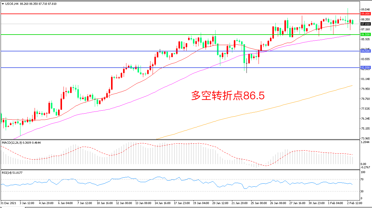 交易策略:在86.50之上看涨,目标89..00        92.00