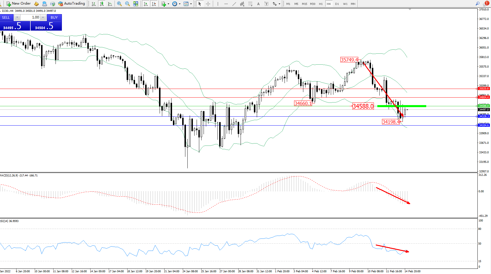 交易策略:34588下方看跌,目标34328、34104