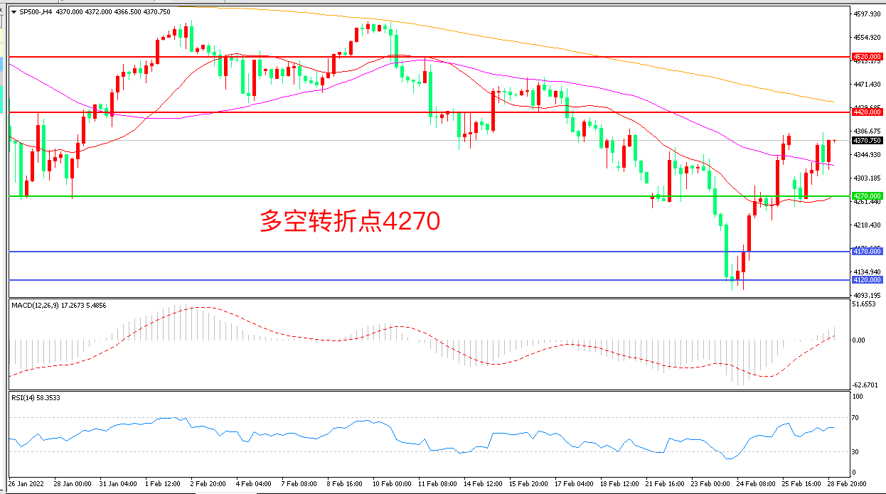 周一(2月28日),西方大举与俄制裁令避险情绪高涨,投资者权衡俄罗斯与乌克兰的谈判的前景,多空角力推动标普500小幅回暖,收报4370点。本周最重要的美联储官员讲话将来自美联储主席杰罗姆·鲍威尔,这将是他在3月5日FOMC缄默期开始前最后一次公开亮相,市场预计鲍威尔将采取渐进的加息方式,如果美联储加息节奏偏快,对美股将形成进一步压制。