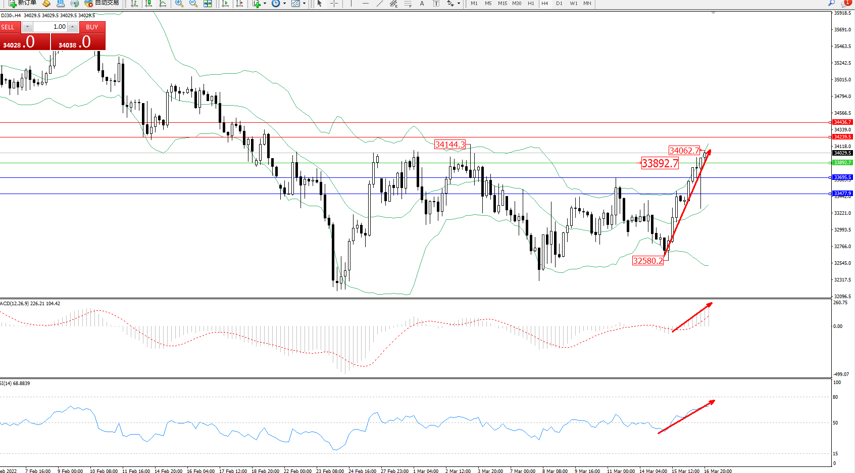 技术点评:多头动力延续布林带指标上轨附近强势拉升上扬,短期抵达34062位置节点后有继续上移迹象,布林带指标呈张口走势持续中,MACD指标处于多头区域维持整理不断向上移动中,RSI指标处于多头区域维持整理向上徘徊中;