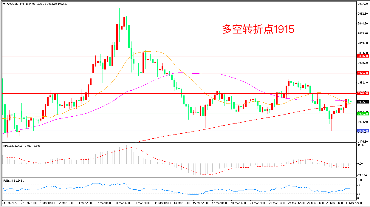 周四(3月30日),白宫称,拜登将准备与普京进行直接会谈,但会谈的前提是,俄罗斯能就美方提出的一些条件做出保证,避险情绪卷土重来,现货黄金大幅走高,收报1933.13美元/盎司。昨晚公布的美国3月ADP就业人数录得增加45.5万人,略高于市场预期,如果周五非农数据与此表现一致,金价可能会再度承压。