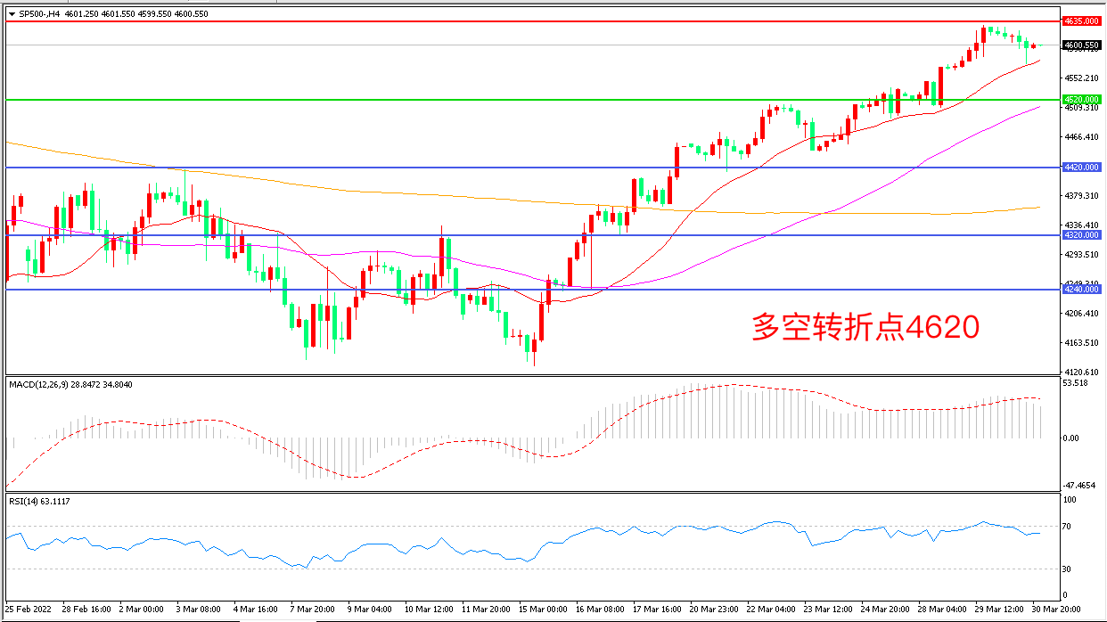 4小时图看,标普500触碰4635一线后小幅回落,21周期均线成为下方支撑,均线系统呈多头排列,MACD红柱增加,RSI指标走平,日内震荡上行概率较大。