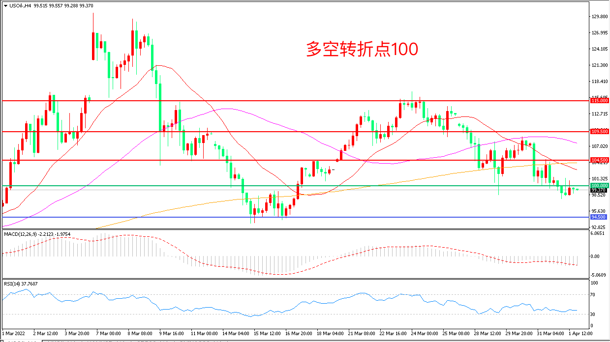 4小时图看,油价连续下行,短线走势陷入低迷,21周期均线成为上方阻力,100美元成为多空分水岭,MACD绿柱增加,RSI指标走平,日内延续震荡概率较大。