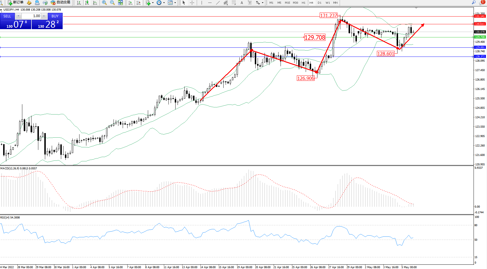 交易策略:129.708上方看涨,目标130.611、131.141