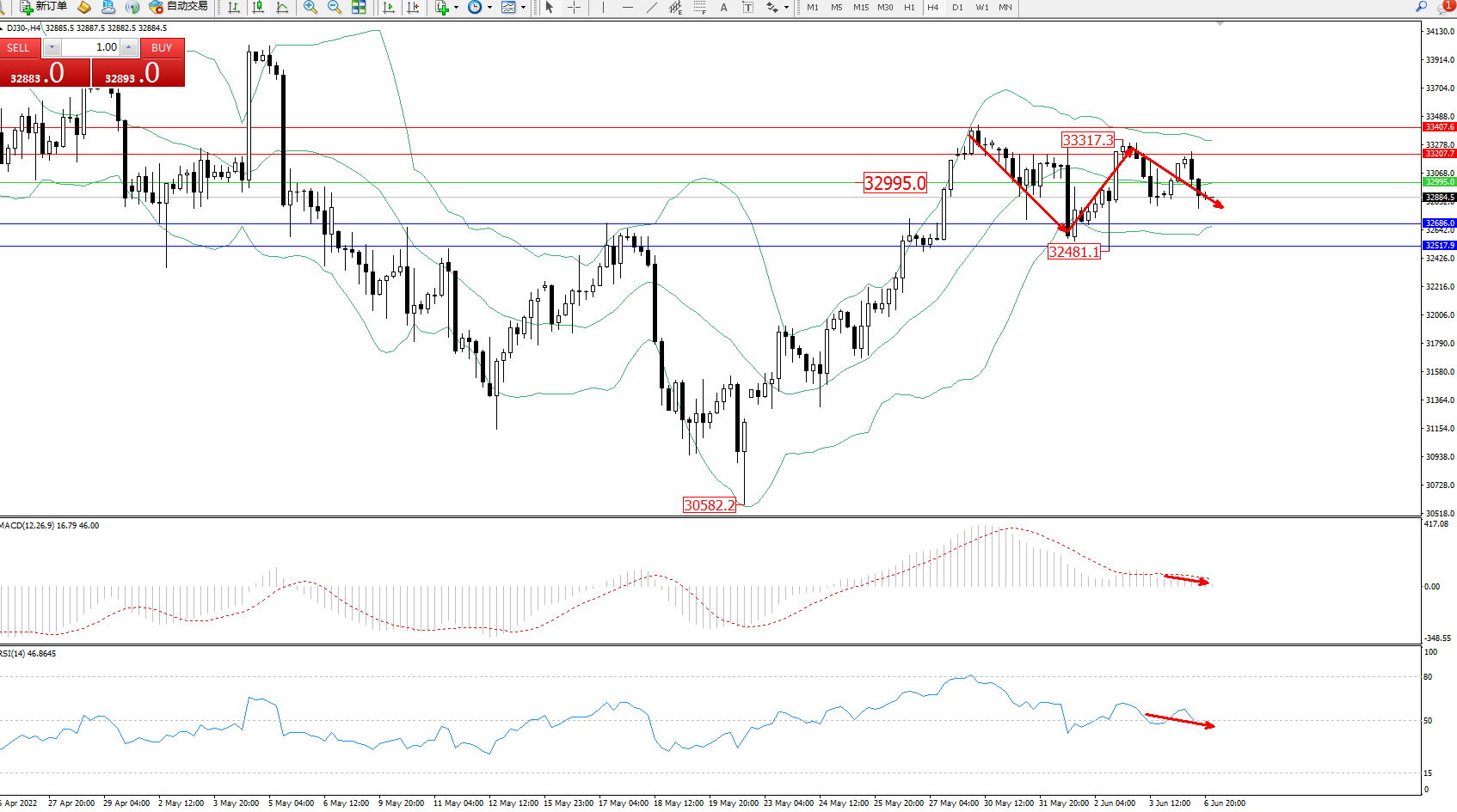 交易策略:32995下方看跌,目标32686、32517
