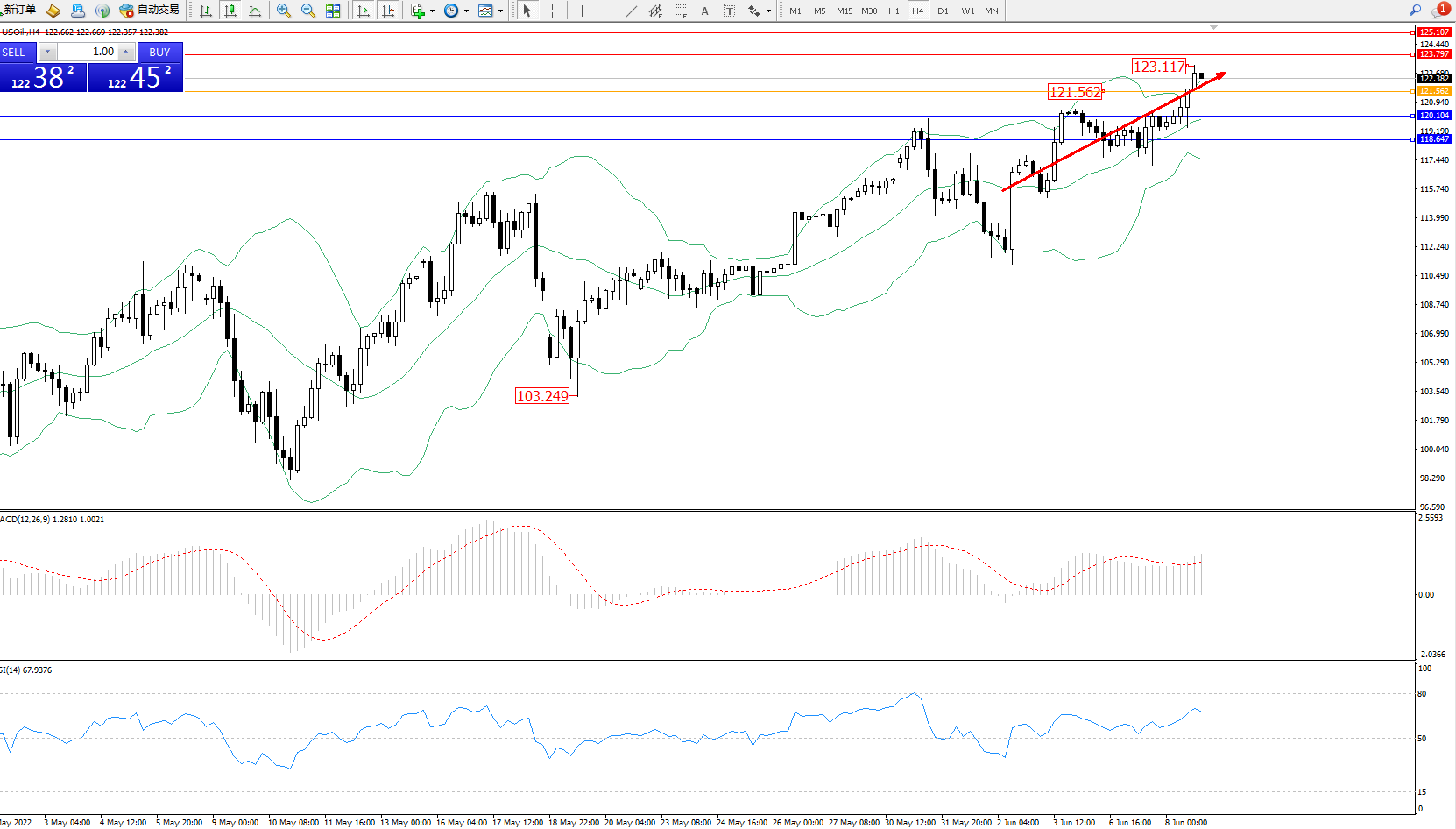 交易策略:121.562上方看涨,目标123.797、125.107