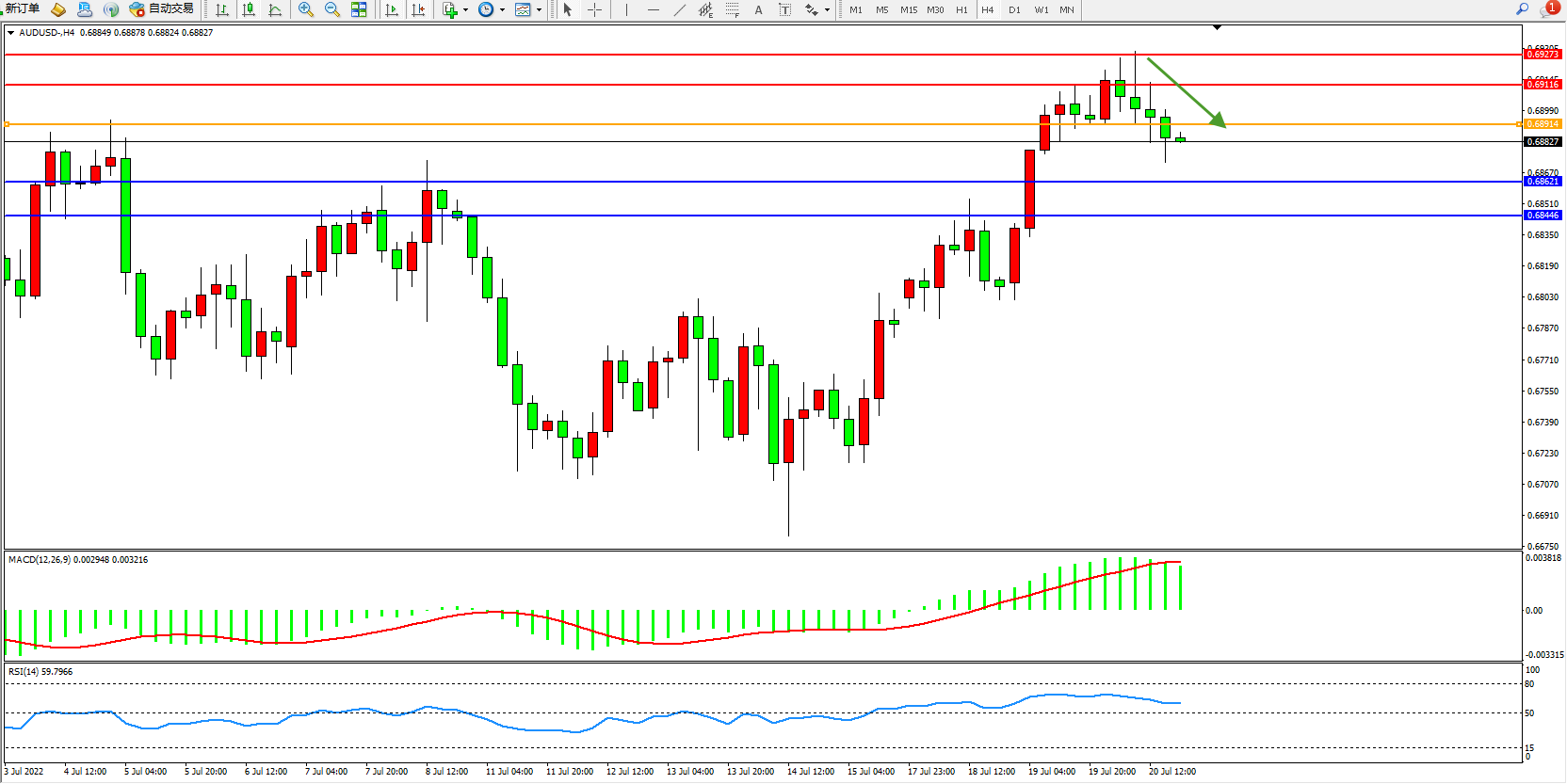 澳元美元AUDUSD——4小时K线图显示: