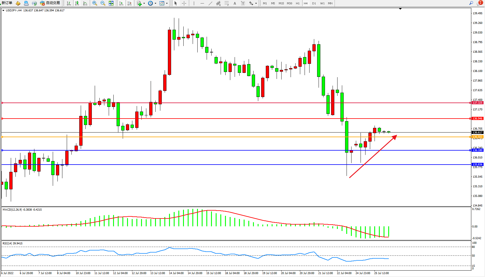 交易策略:136.503上方看涨,目标136.946、137.325