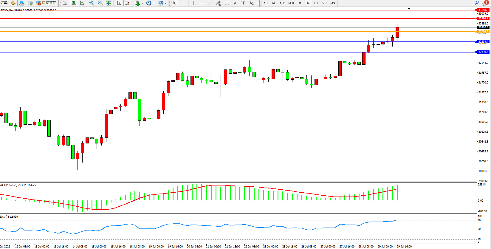 道琼斯指数DJ30——4小时K线图显示: