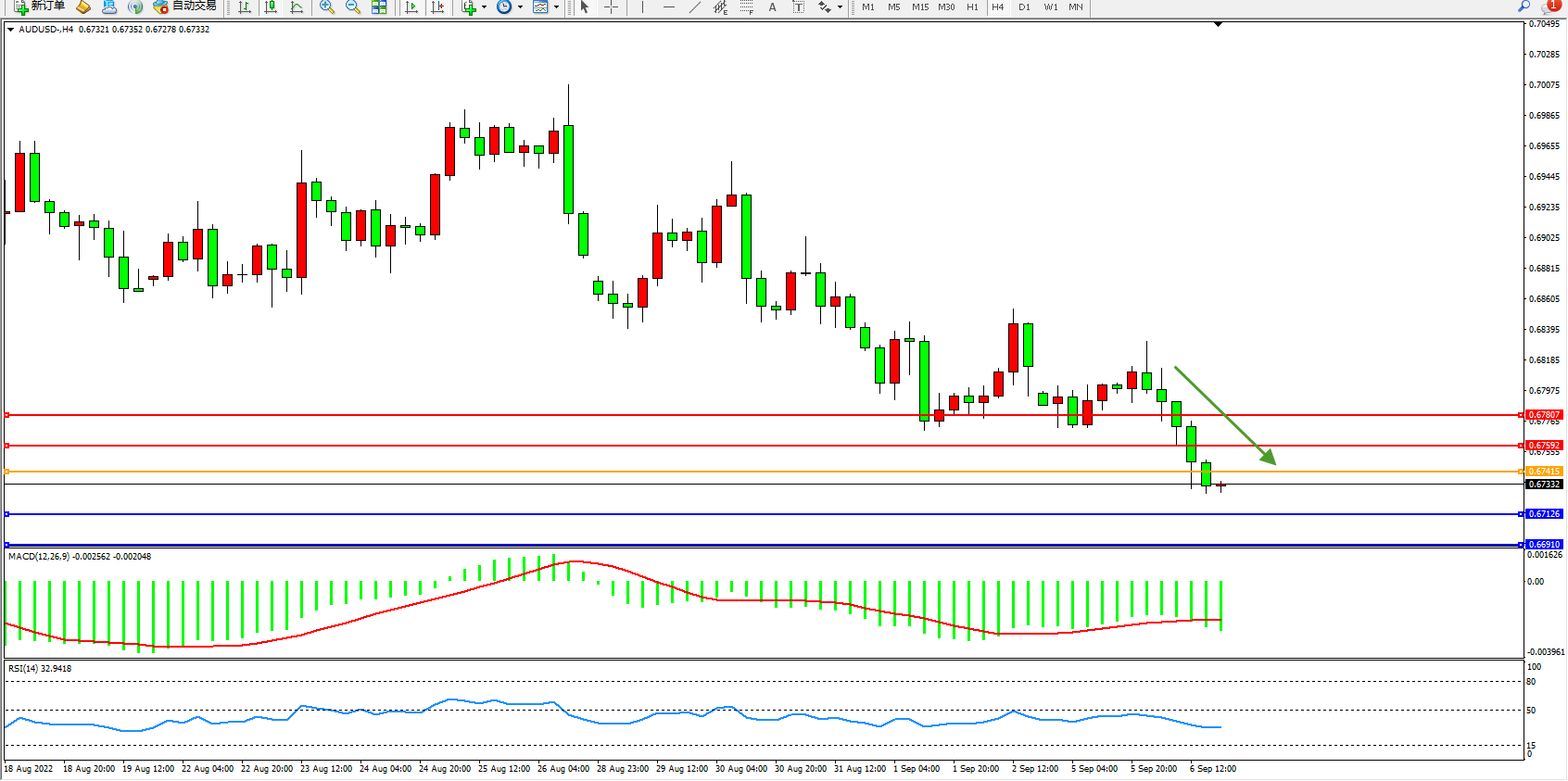 澳元美元AUDUSD——4小时K线图显示: