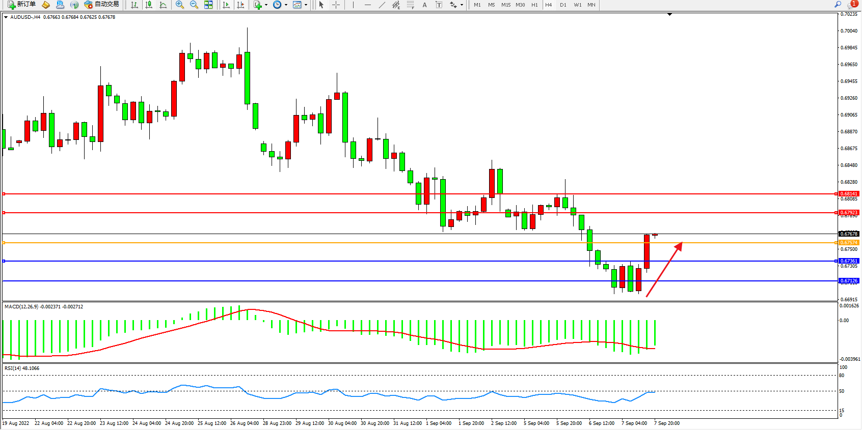 澳元美元AUDUSD——4小时K线图显示: