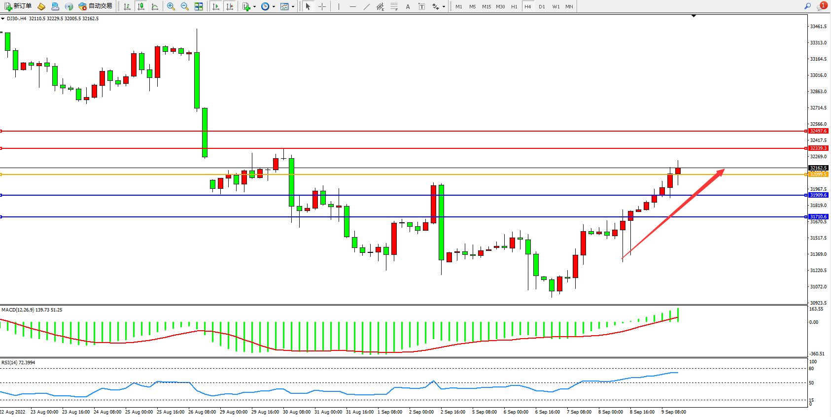 道琼斯指数DJ30——4小时K线图显示: