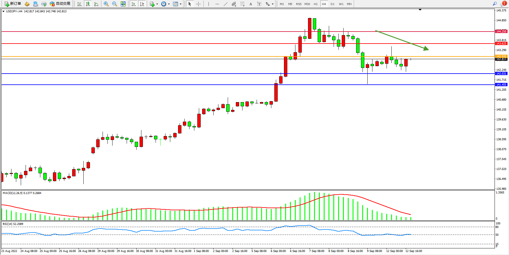交易策略:142.935下方看跌,目标142.031、141.455
