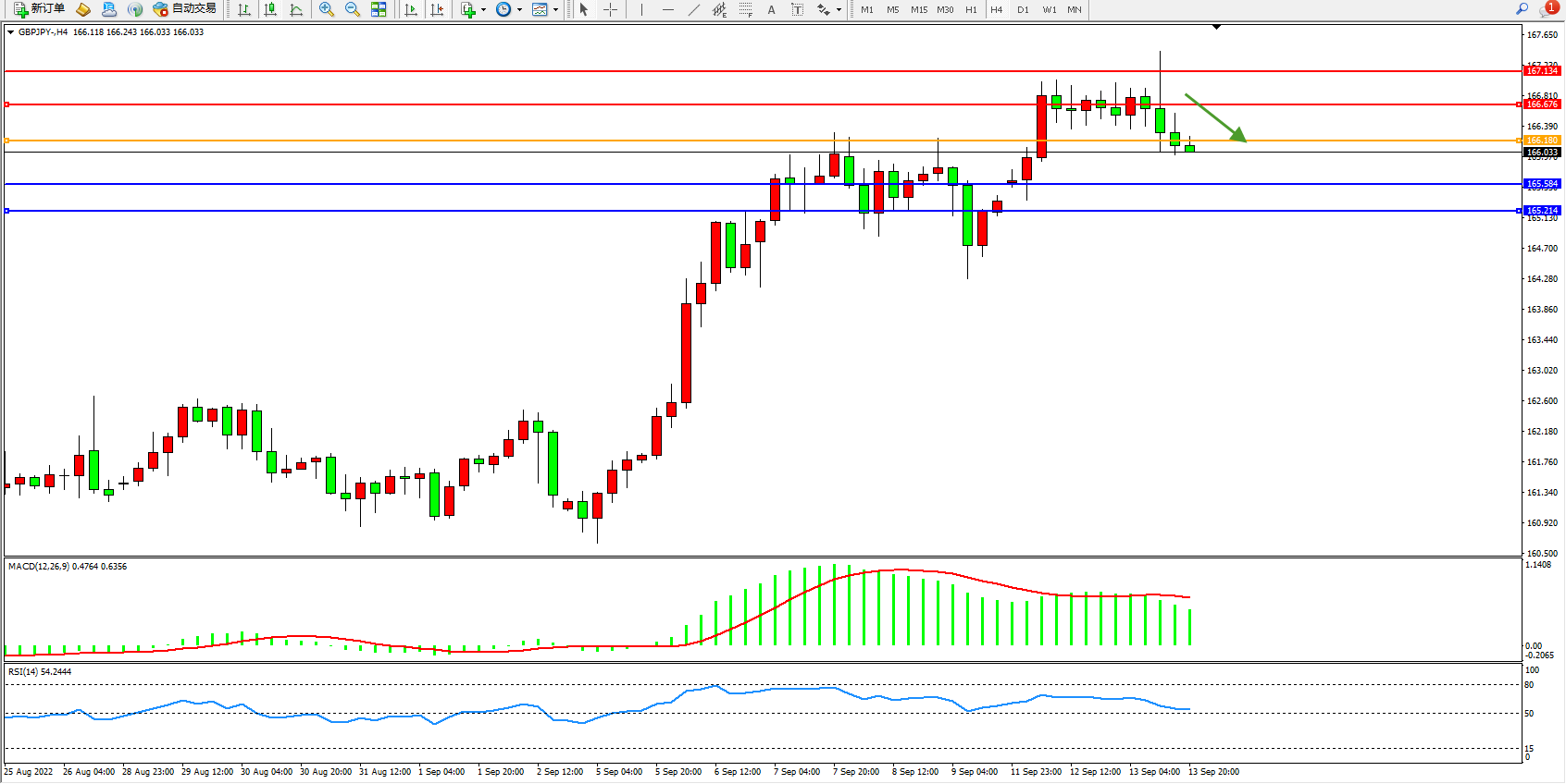交易策略:166.180下方看跌,目标165.584、165.214