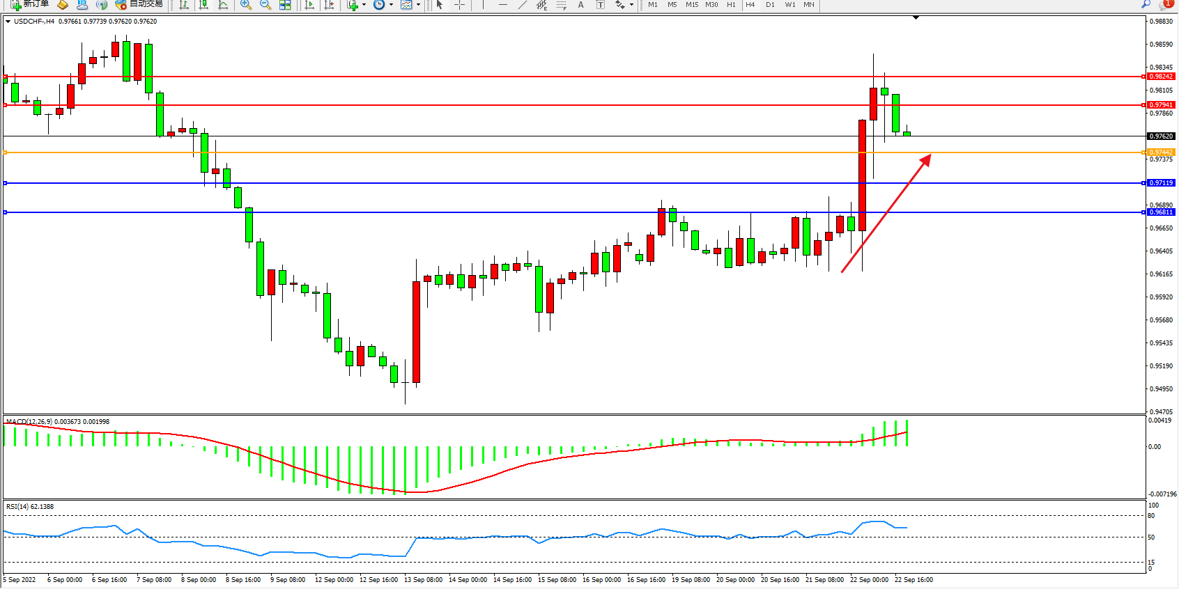美元瑞郎USDCHF——4小时K线图显示: