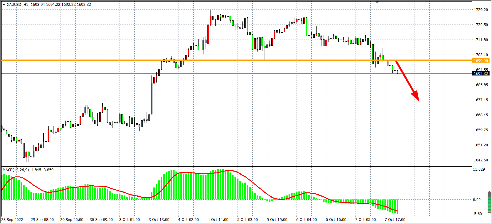 4小时图看,金价在1725出现再度受阻后回落跌破1700支撑,MACD于零轴之上也开始急剧缩量,显示行情或有进一步走低空间,日内在1700看跌为主,下方目标1680-1660。