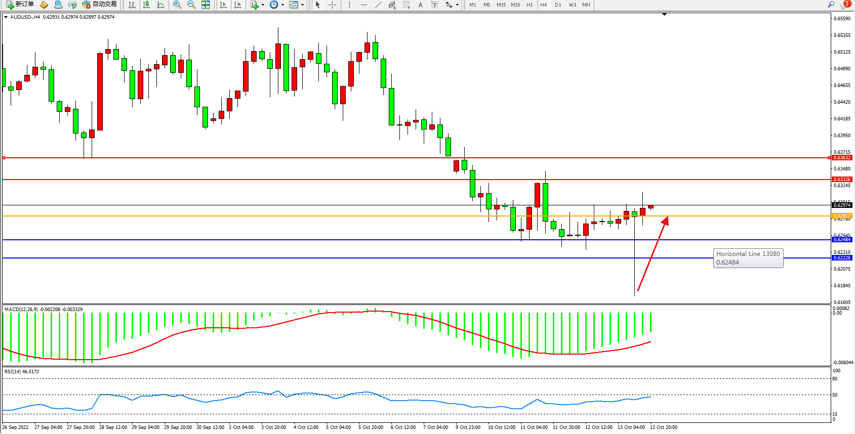 澳元美元AUDUSD——4小时K线图显示: