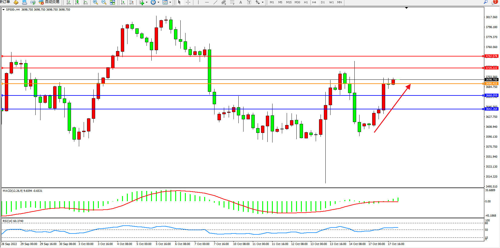 标普SP500——4小时K线图显示: