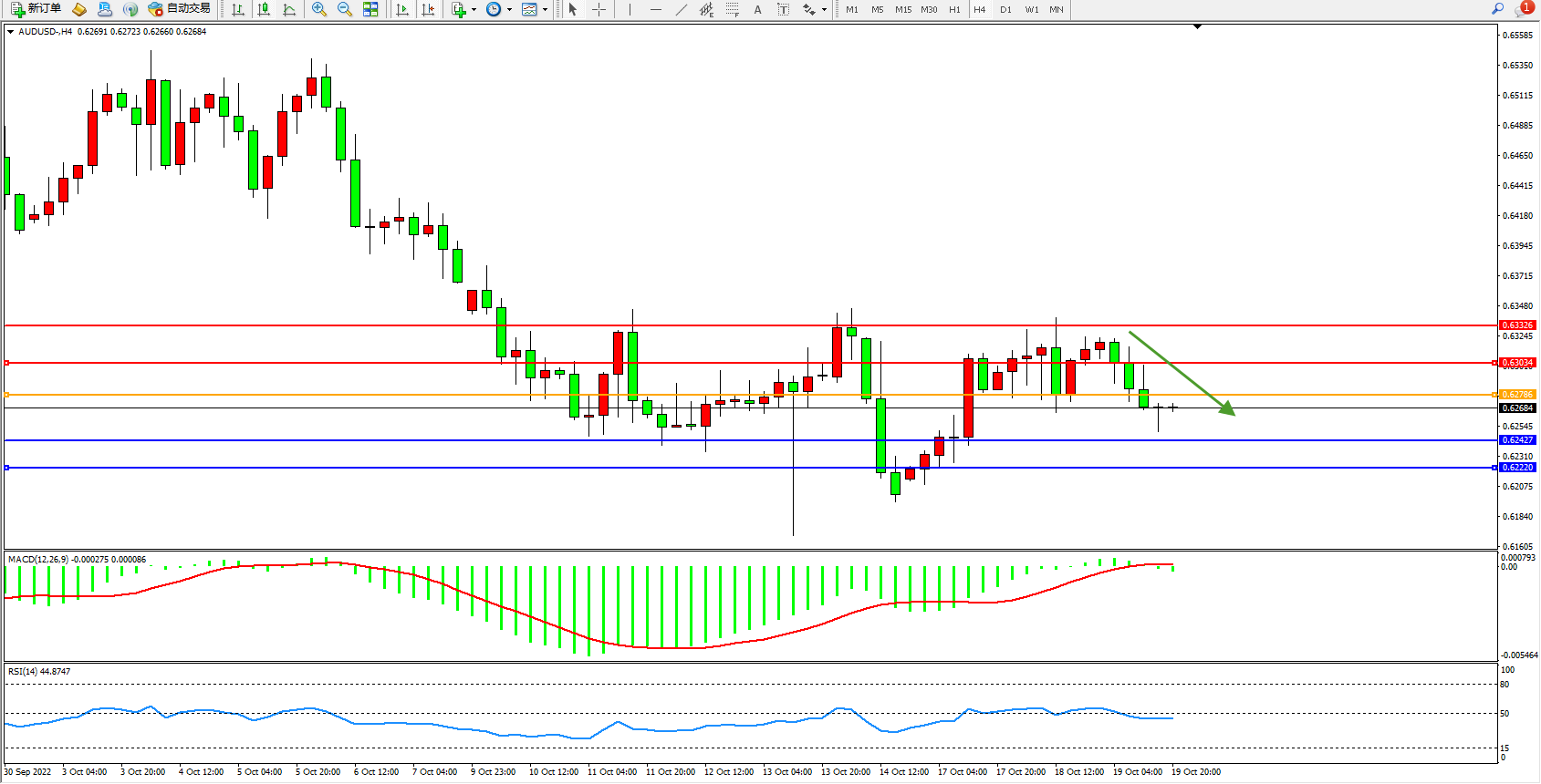 澳元美元AUDUSD——4小时K线图显示: