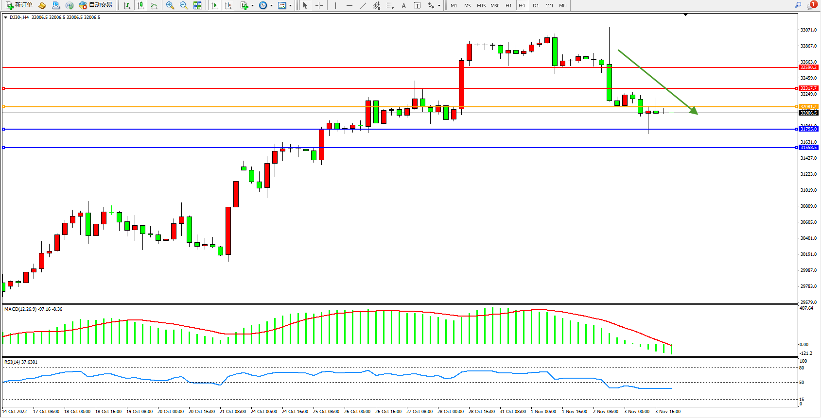 道琼斯指数11月3日(周四)收盘下跌148.42点,跌幅0.46%,报31999.34点;美国9月贸易逆差大幅扩大,可能是由于美元走强和全球需求疲软打压了出口。贸易逆差的缩小是美国第三季度GDP反弹的主要动力,美国第三季度GDP年化季率录得2.6%,时隔两个季度重回正值。