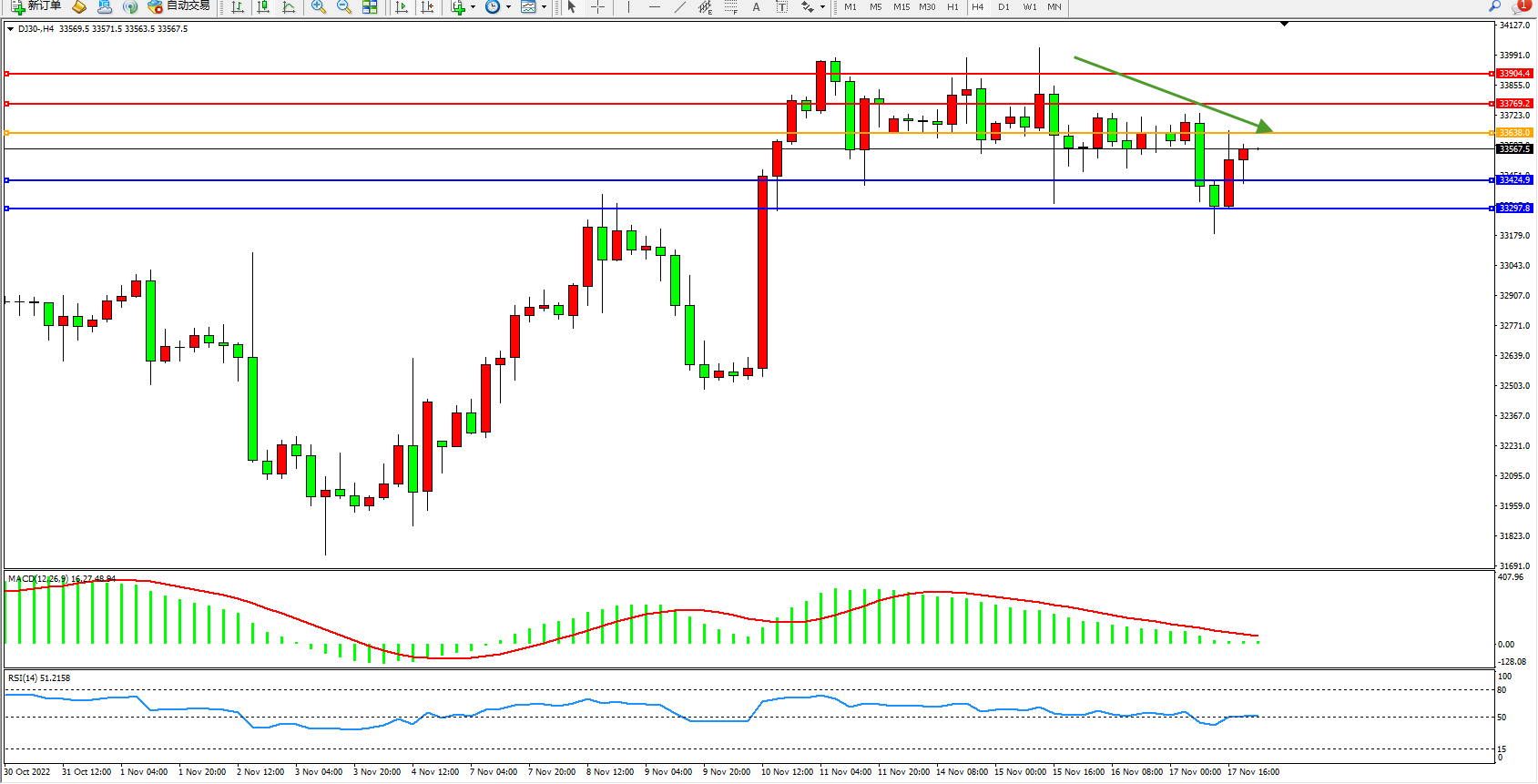 道琼斯指数DJ30——4小时K线图显示:
