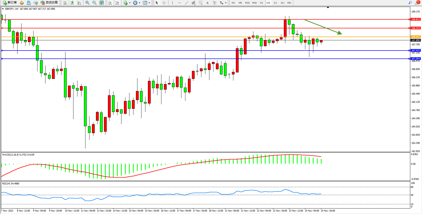 交易策略:168.042下方看跌,目标167.422、167.054