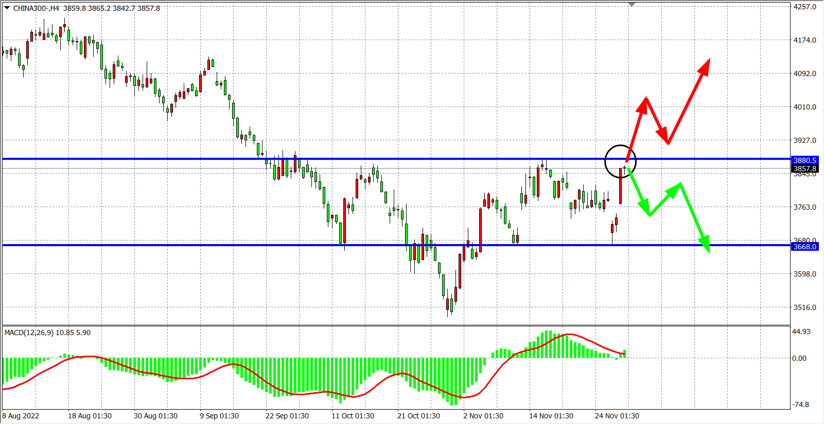 4小时图看,沪深300在前低点2680之上继续走强,一举突破3800的防线,MACD量能柱在零轴之上开始放量,日内有望延续涨势,第一压力关注3880,上破看至 4000点附近。