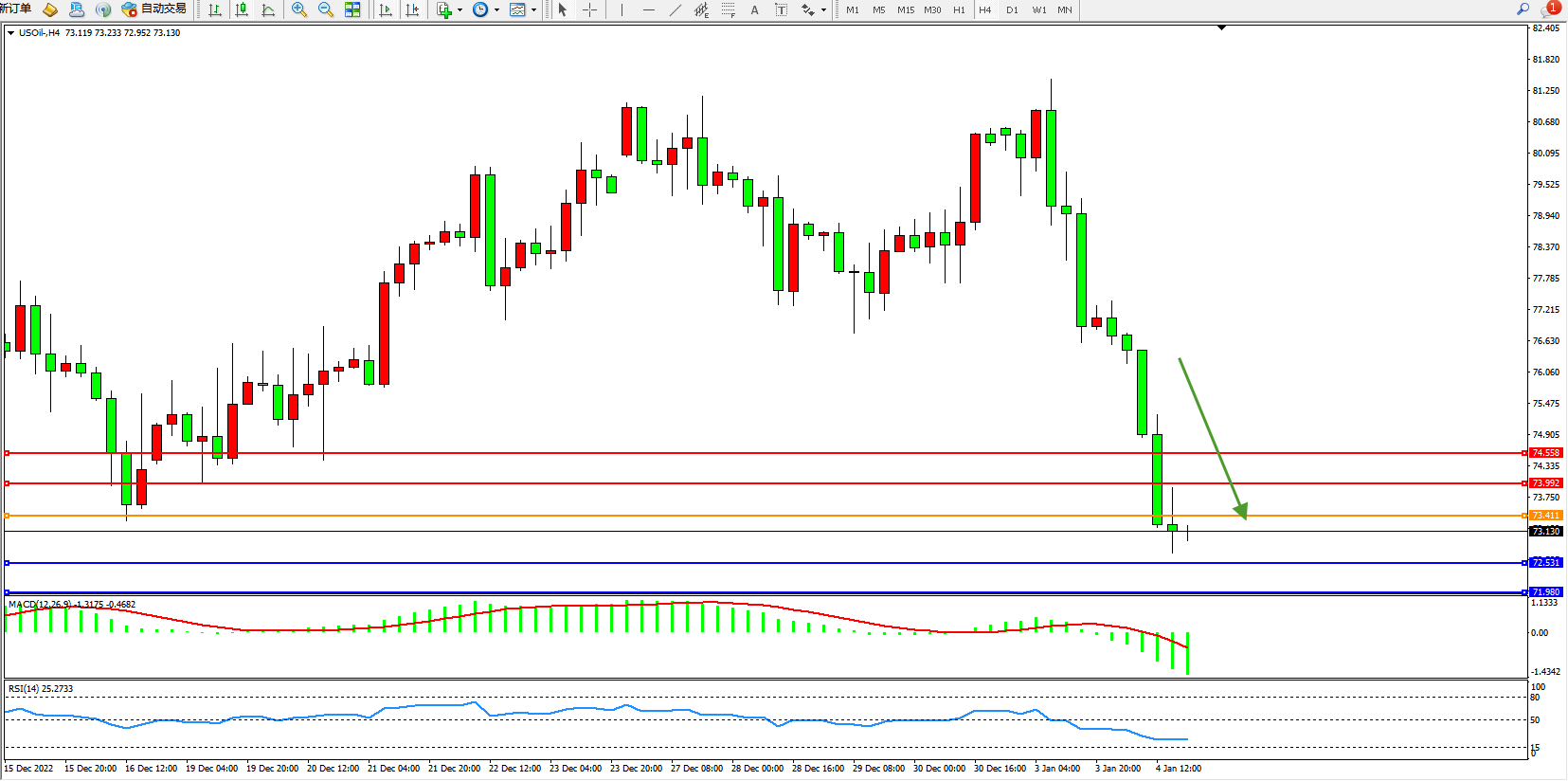 交易策略:73.411下方看跌,目标72.531、71.980