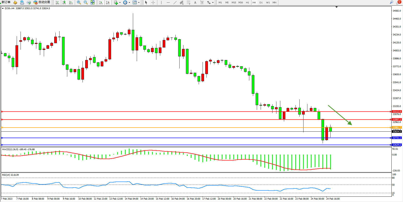 道琼斯指数DJ30——4小时K线图显示: