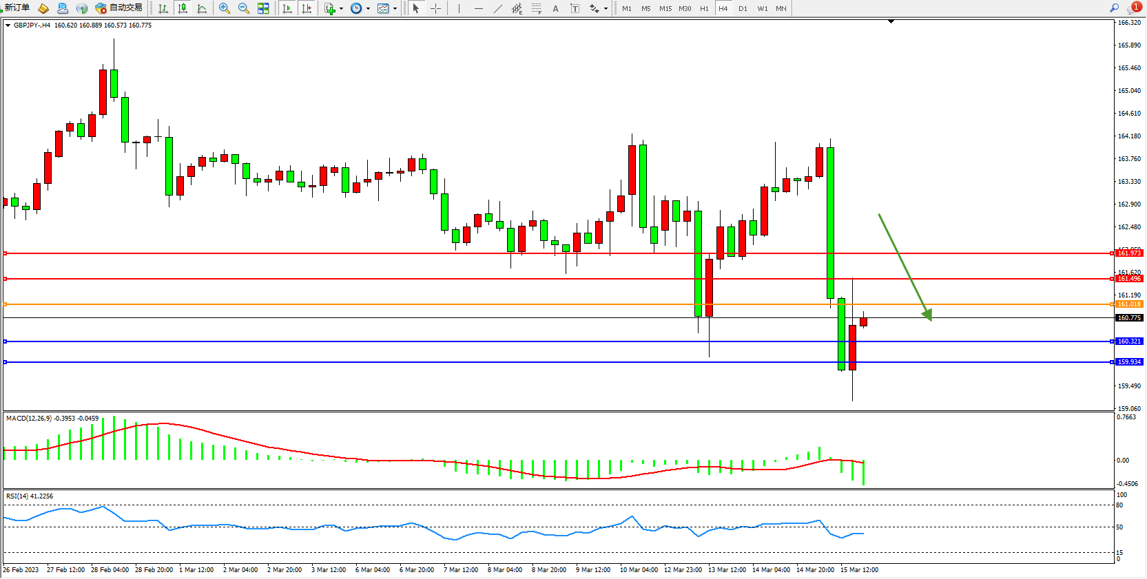 4小时图看:空头动力强势震荡下挫,短期或纠结低位整理,MADC指标处于空头区域整理,RSI指标处于50均衡线下侧弱势整理;