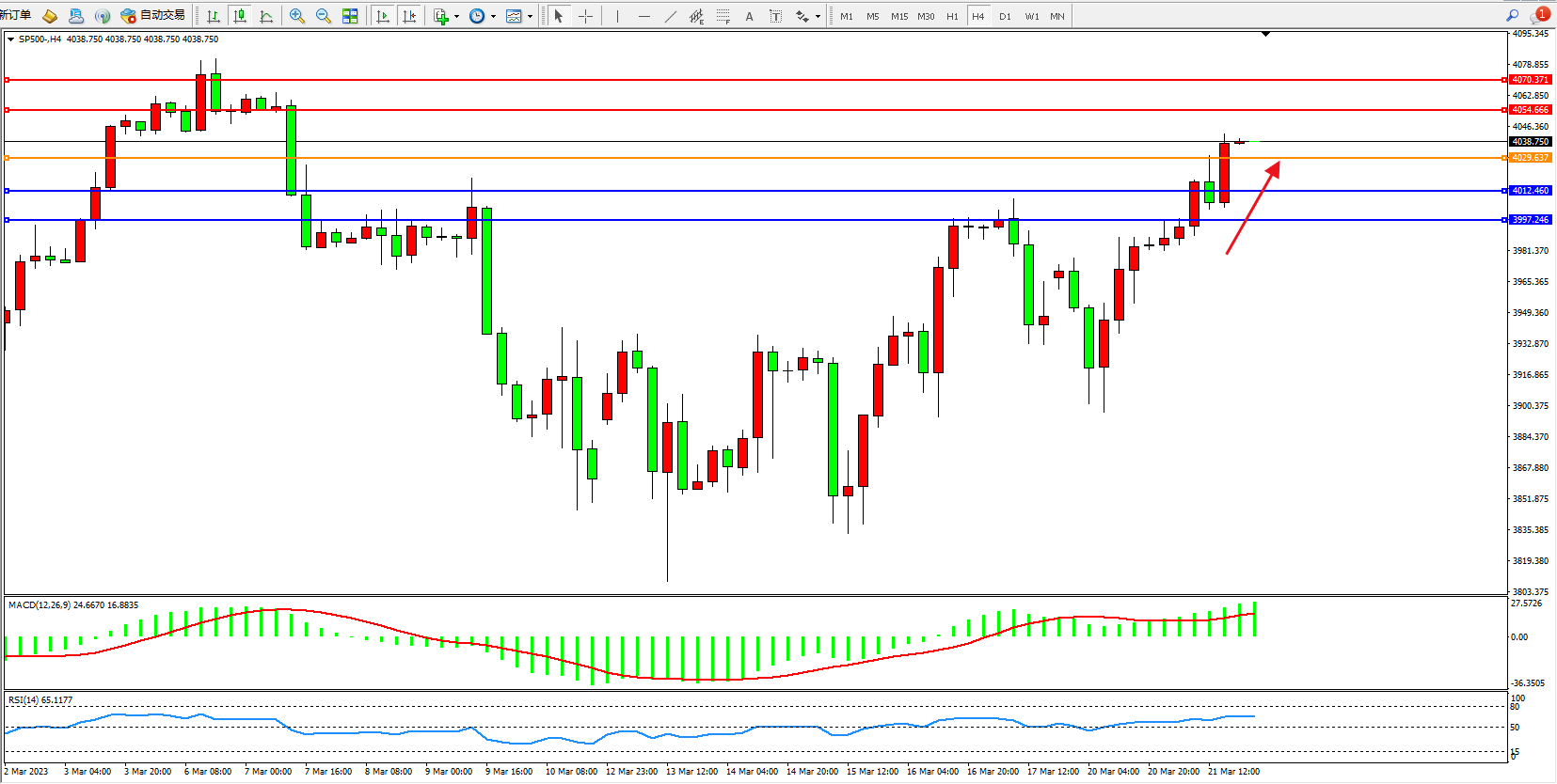 标普SP500——4小时K线图显示: