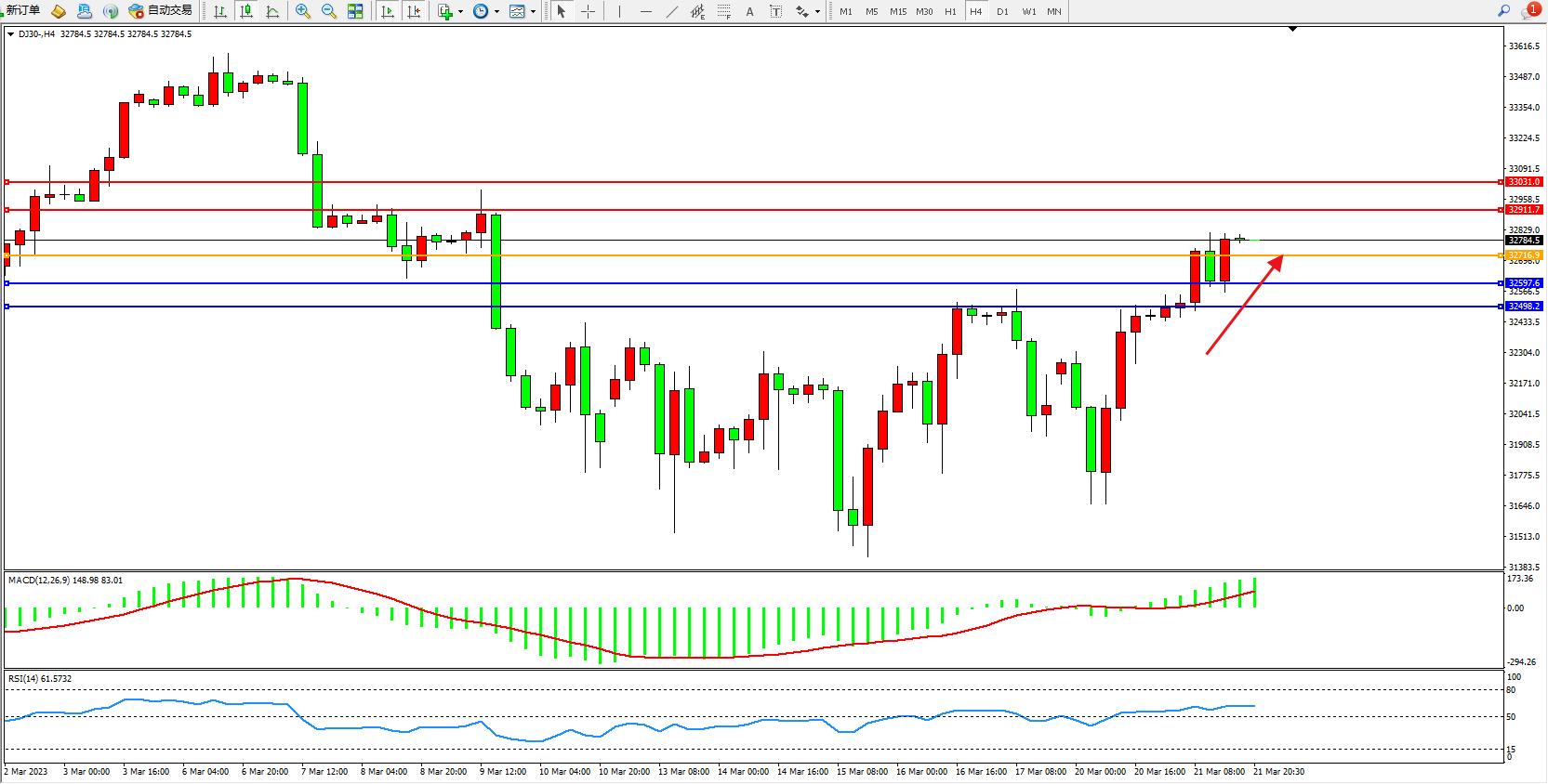 道琼斯指数DJ30——4小时K线图显示: