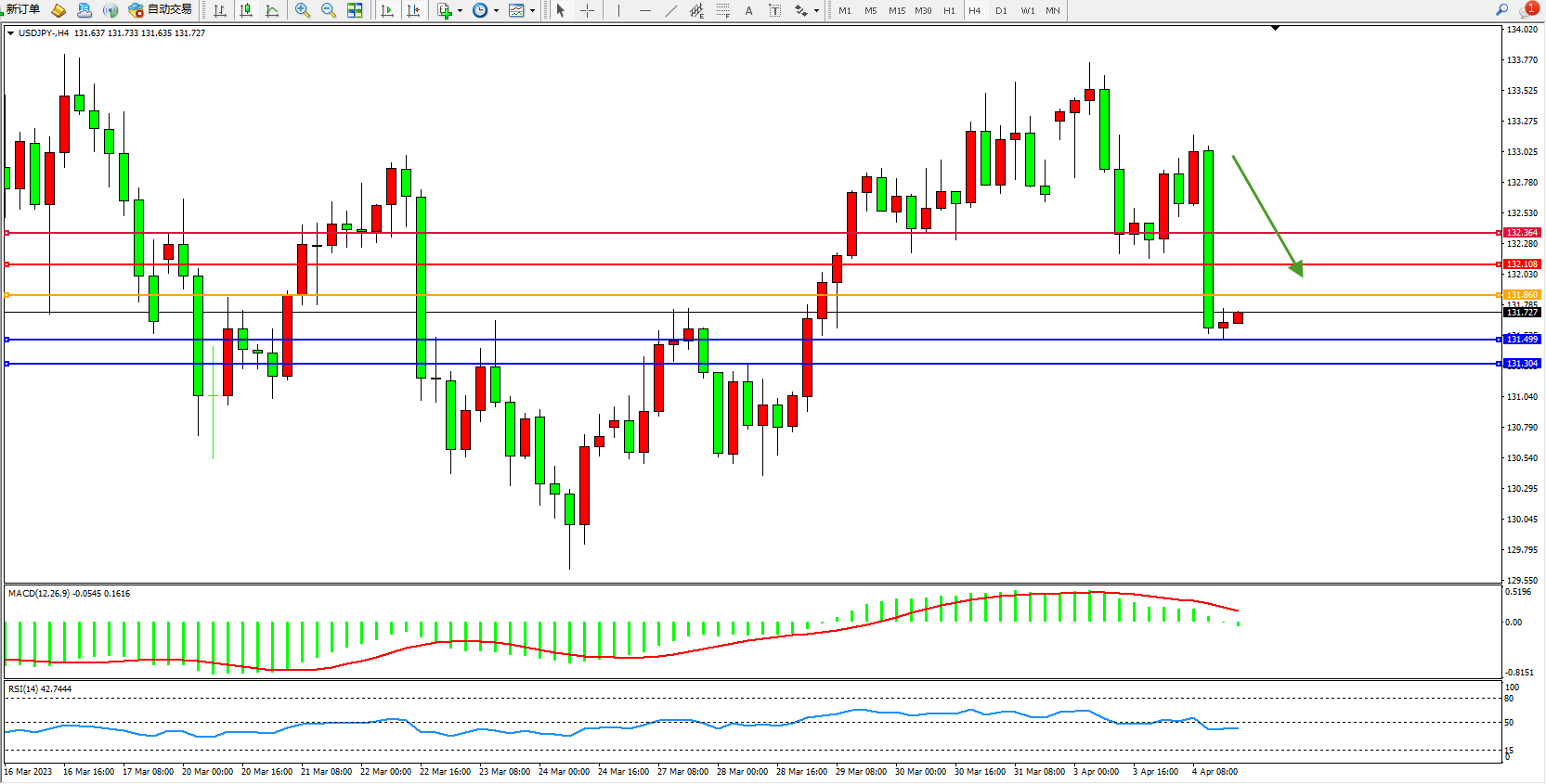 交易策略:131.860下方看跌,目标131.499  131.394