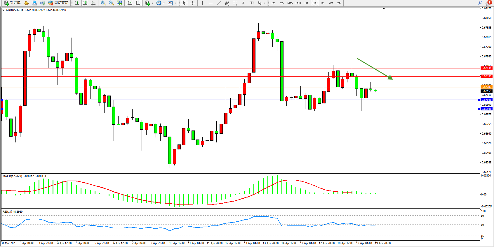 澳元美元AUDUSD——4小时K线图显示: