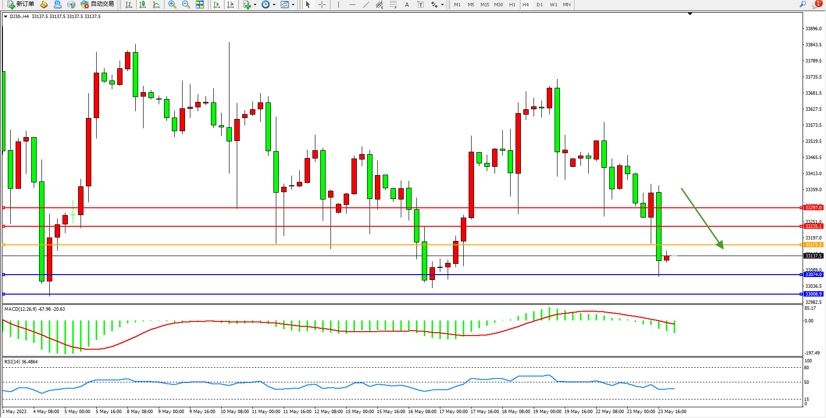 道琼斯指数DJ30——4小时K线图显示: