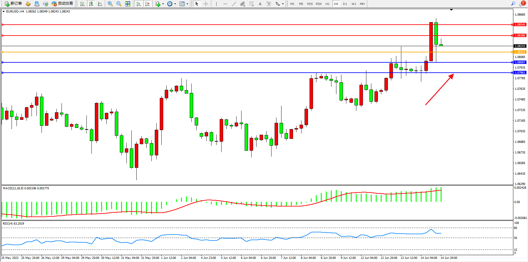 4小时图看:多头动力强势震荡上扬遇阻震荡,市场多头动力高位巨震,MACD指标处于多头区域高位整理,RSI指标处于多头区域整理;
