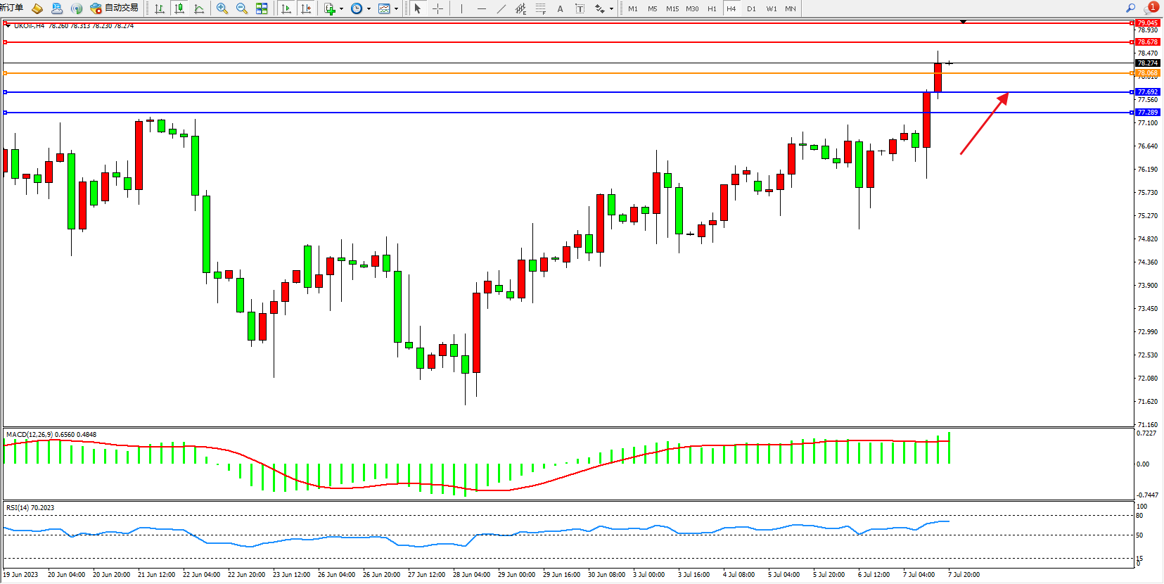 交易策略:78.068上方看涨,目标78.678 79.045