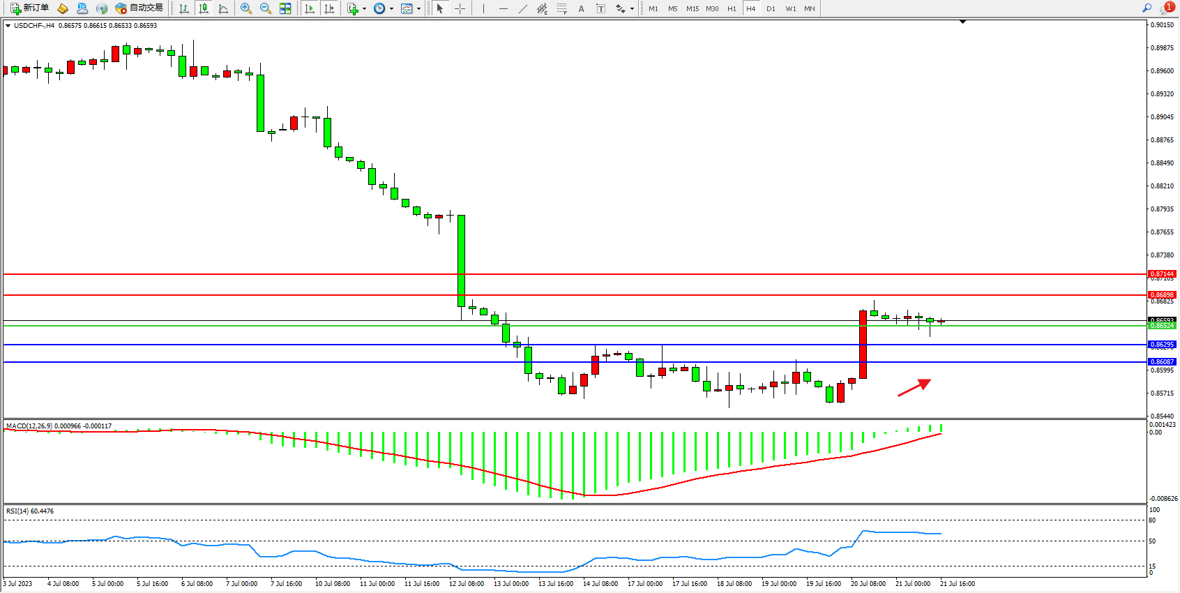 4小时图看:低位多头短期拉升后弱势整理,市场多头动力有所减弱,但依旧有进一步向上移动态势,MACD指标处于0轴线上側整理,RSI指标处于多头区域维持震荡;