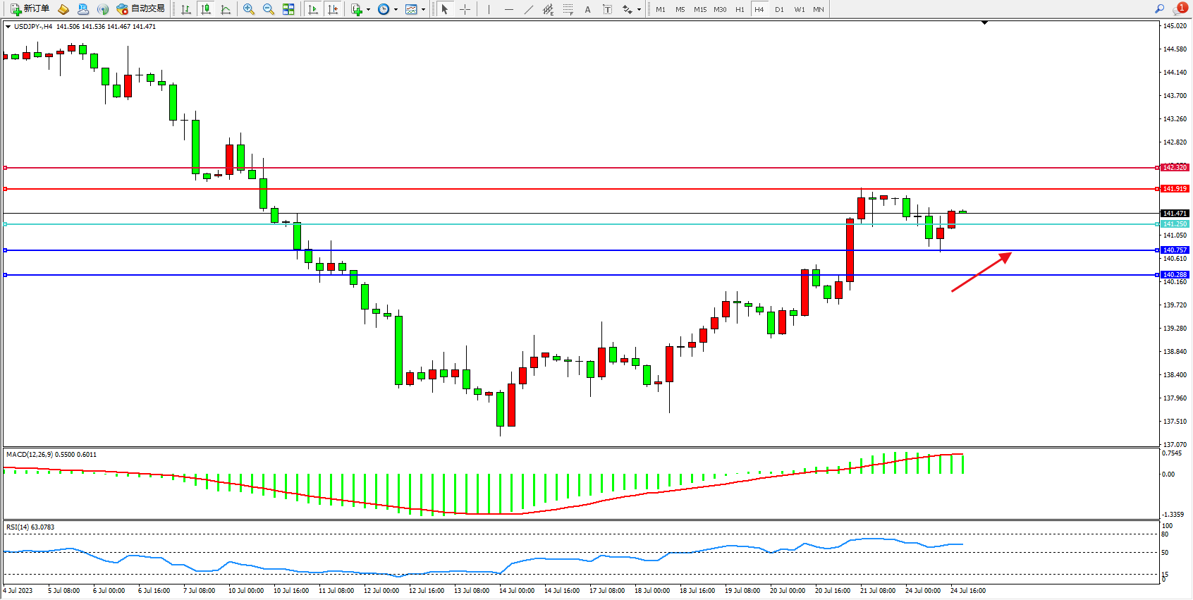 交易策略:141.250上方看涨,目标141.919 142.320