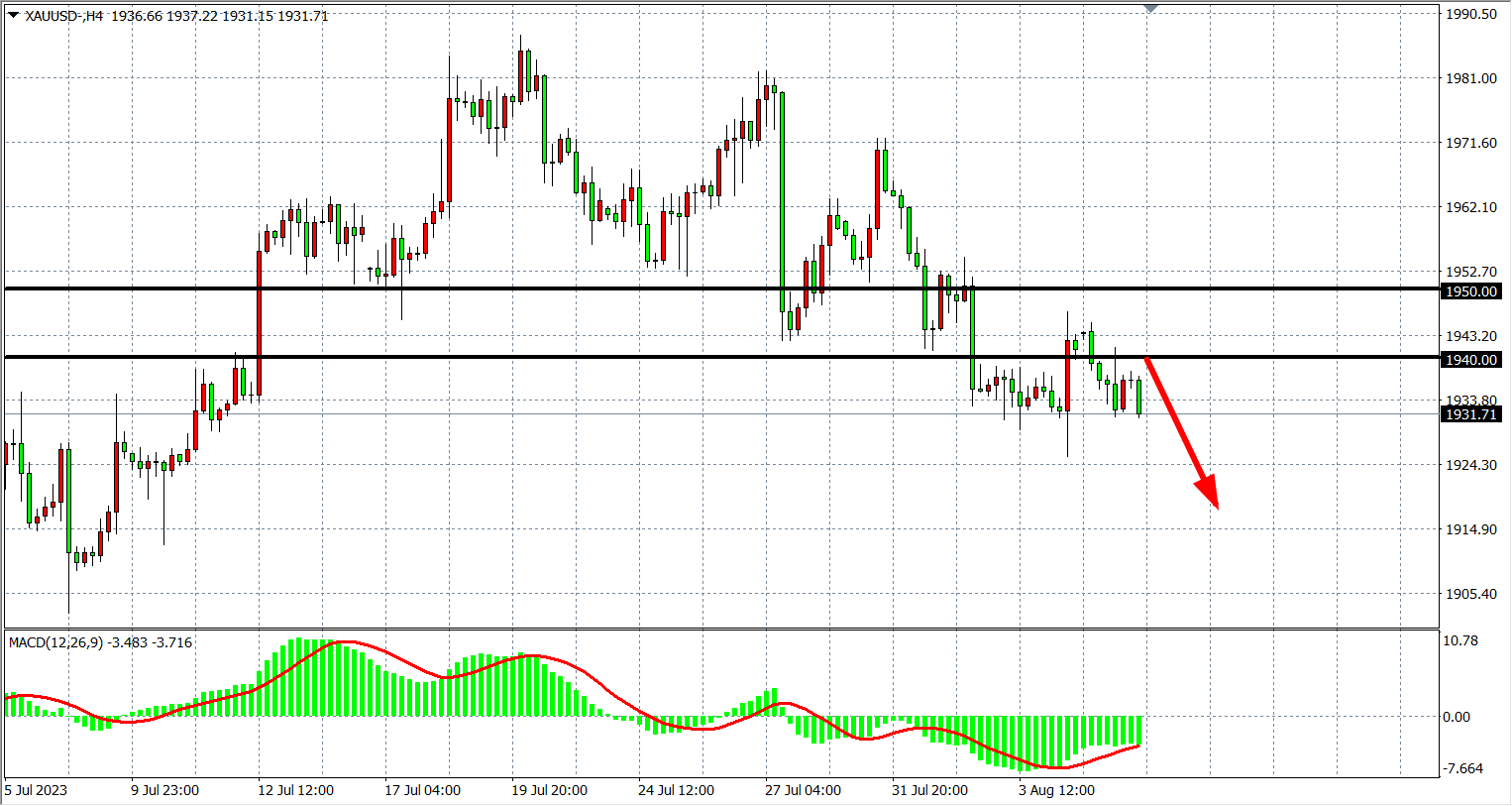 4小时图看,黄金再度回落到1940下方,MACD量能维持零轴下,走势再度回归弱势,支撑关注1925,阻力看1940-1950。