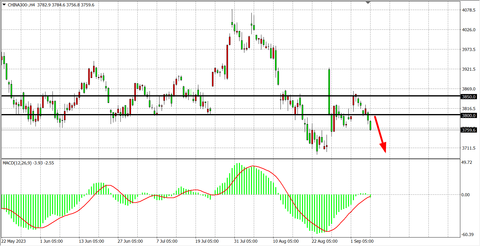 4小时图看,沪深300跌破3800,支撑转为阻力,MACD量能在零轴下缩量,短期行情再走空,阻力关注3800附近,支撑关注3730-3690。