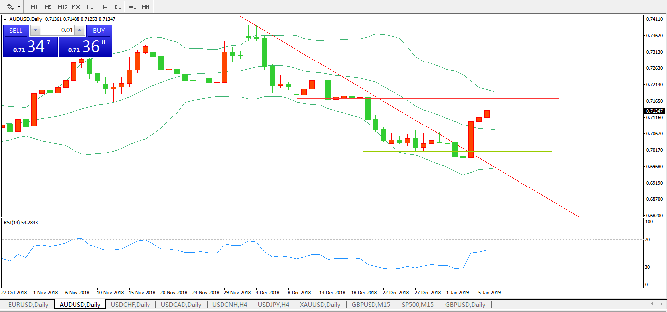 技术面简析:布林带开口开始拐头,价格升穿布林中轨,RSI拐头向上攻击,下降趋势线被击破,预计短期汇价将延续上行态势。