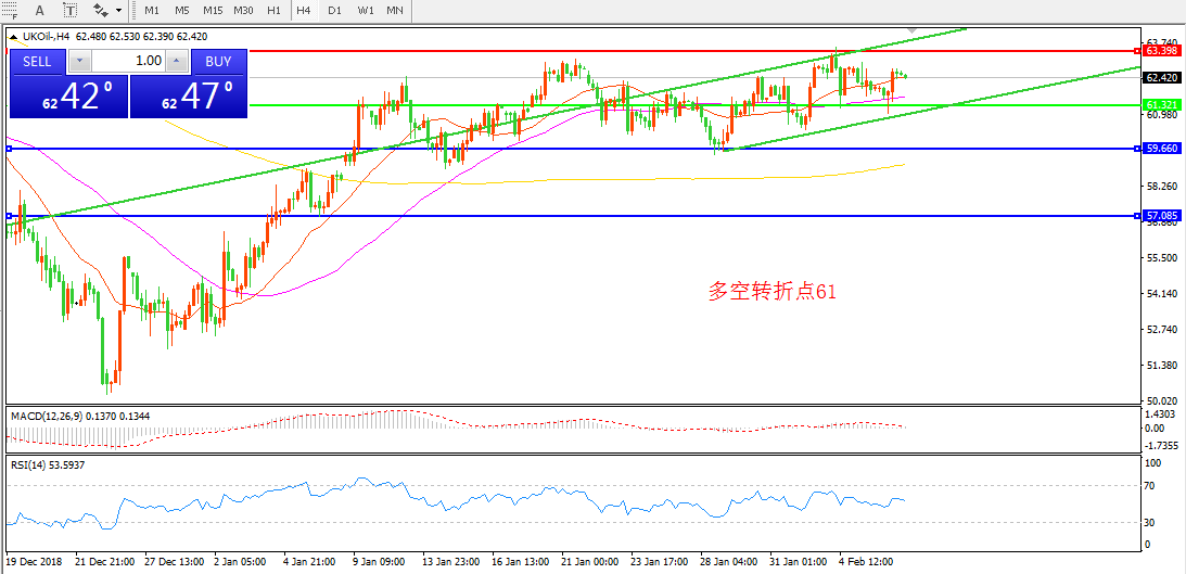4小时图看,油价触碰63美金后回落整理,形态上高点低点逐渐抬高 , MACD红柱缩减,RSI拐头向下,日内关注上方63附近阻力,整体思路多头为主。