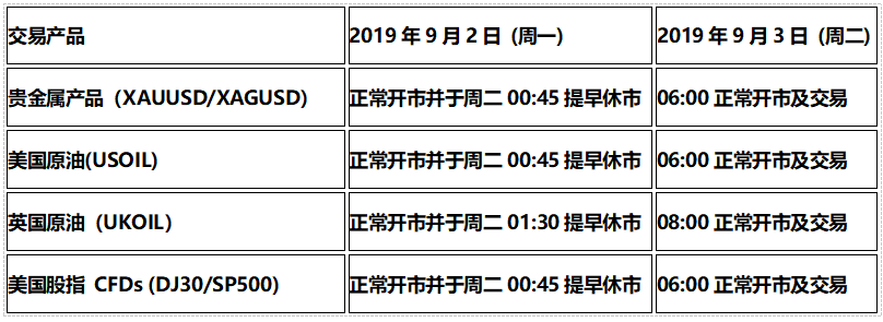 由于美国劳动节假期休市影响,以下美国市场CME/NYSE及伦敦市场ICE交易产品的交易时间将受假期影响提早休市,敬请阁下留意知悉!